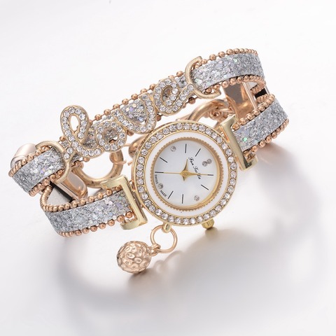 Montre-Bracelet en cuir avec lettres d'amour pour femmes, marque de luxe, à Quartz, pendentif en métal, diamant complet